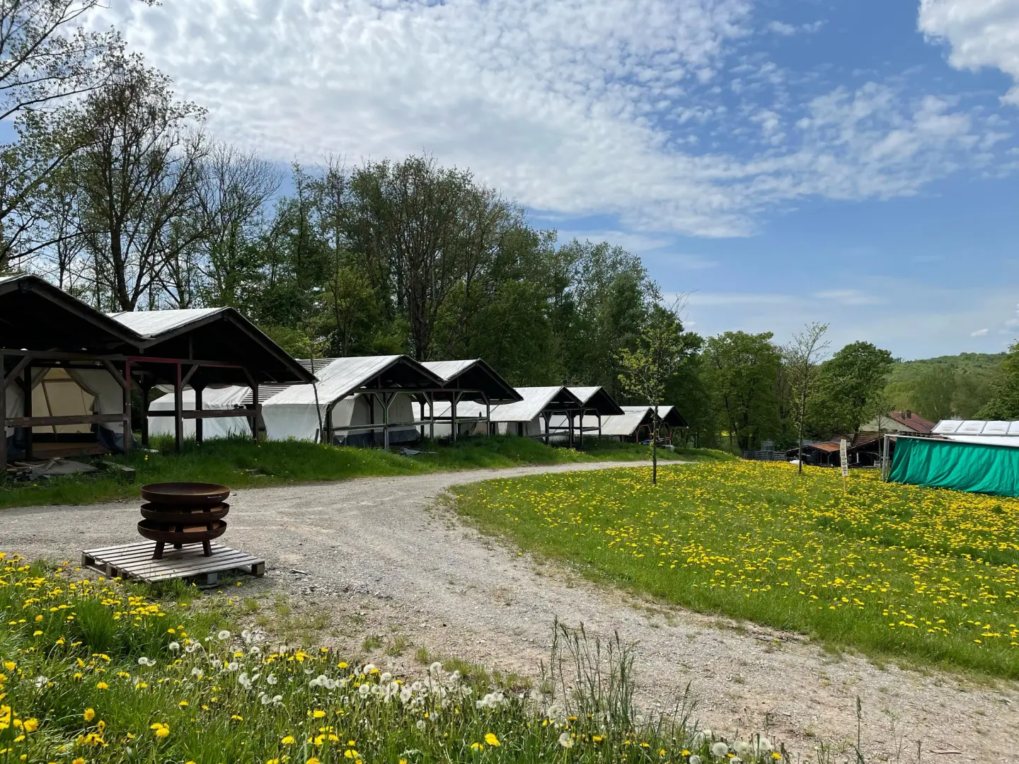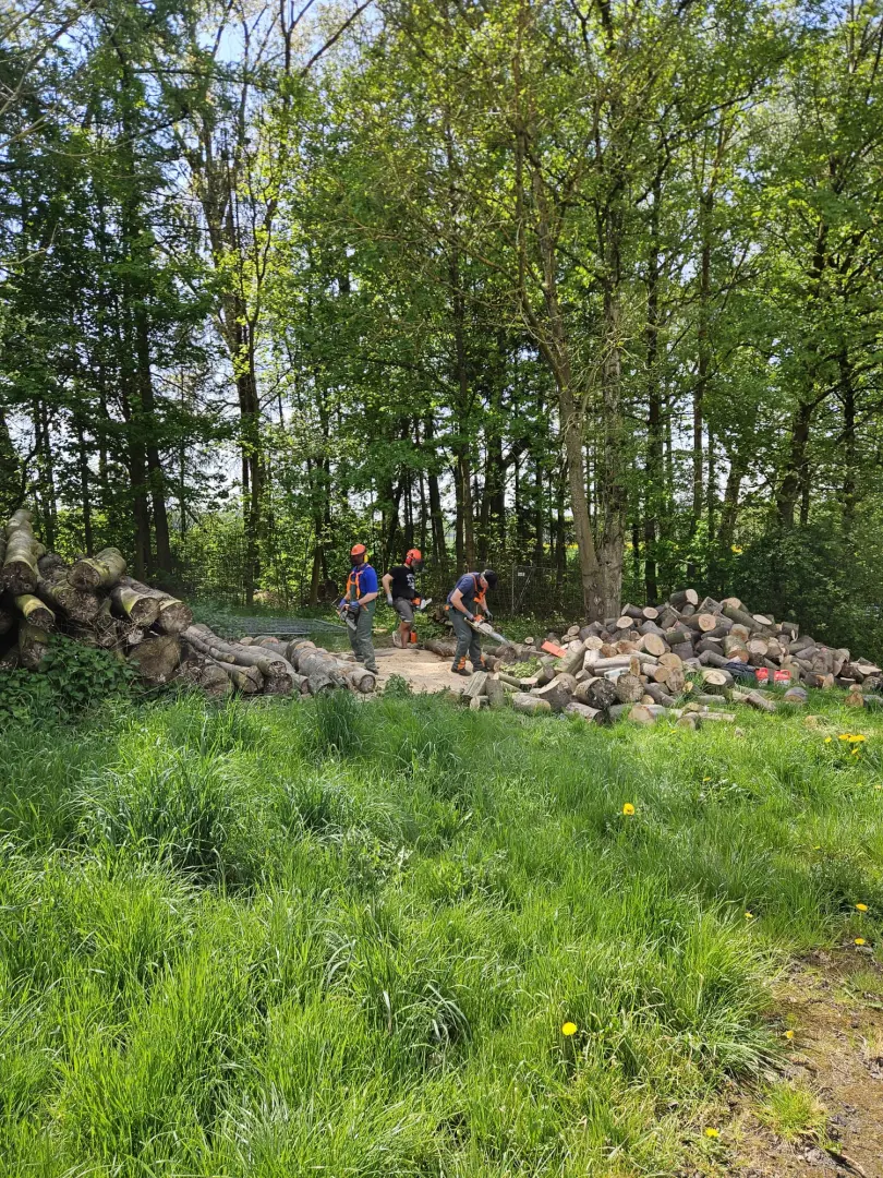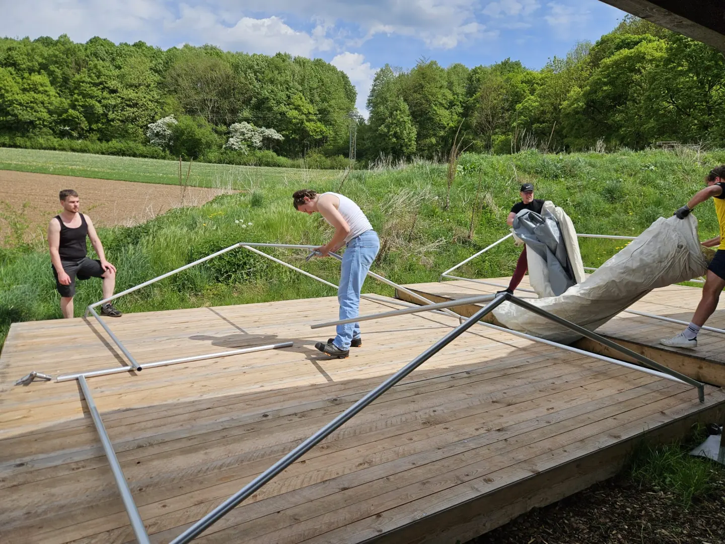 Am nächsten morgen um 08:30 Uhr empfing uns Noah Driesner mit den Worten aus 1.Kor13,4-7 und rief die Männer dazu auf, alles in Liebe geschehen zu lassen und darauf zu achten, nicht in Streit zu geraten. Unsere Küchenteam, bestehend aus Eddy Lammert, Jay Martens und Johann Penner, stellten ihre Künste unter Beweis. Ob zum Frühstück, Mittag- oder Abendessen, sie sorgten mit Hingabe für die leiblichen Bedürfnisse der Männer. Ab ca. 09:45 Uhr ging es ans Hüttenbauen. Nach einer kurzen Arbeitsplanung teilten sich die Männer in mehrere Trupps aus. Einige befestigten die Bodenbretter, andere verteilten alle Zelte und Zubehör. Und wieder andere begannen mit dem Aufbau der Zelte. Im Hintergrund lief von morgens bis Abends Kettensägen-Musik. Das drei Mann starke Team zerkleinerte einen mächtigen Haufen Baumstämme. Dieses Holz wurde später noch gespalten und gestapelt. Es soll bei den bevorstehenden Freizeiten für wohlige Lagerfeuer dienen. Viele Bekehrungen hat man gerade in diesen Runden am Feuer in der Vergangenheit erlebt.