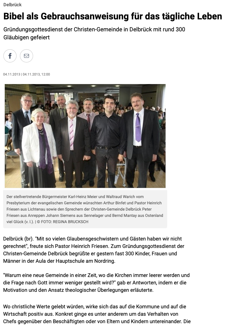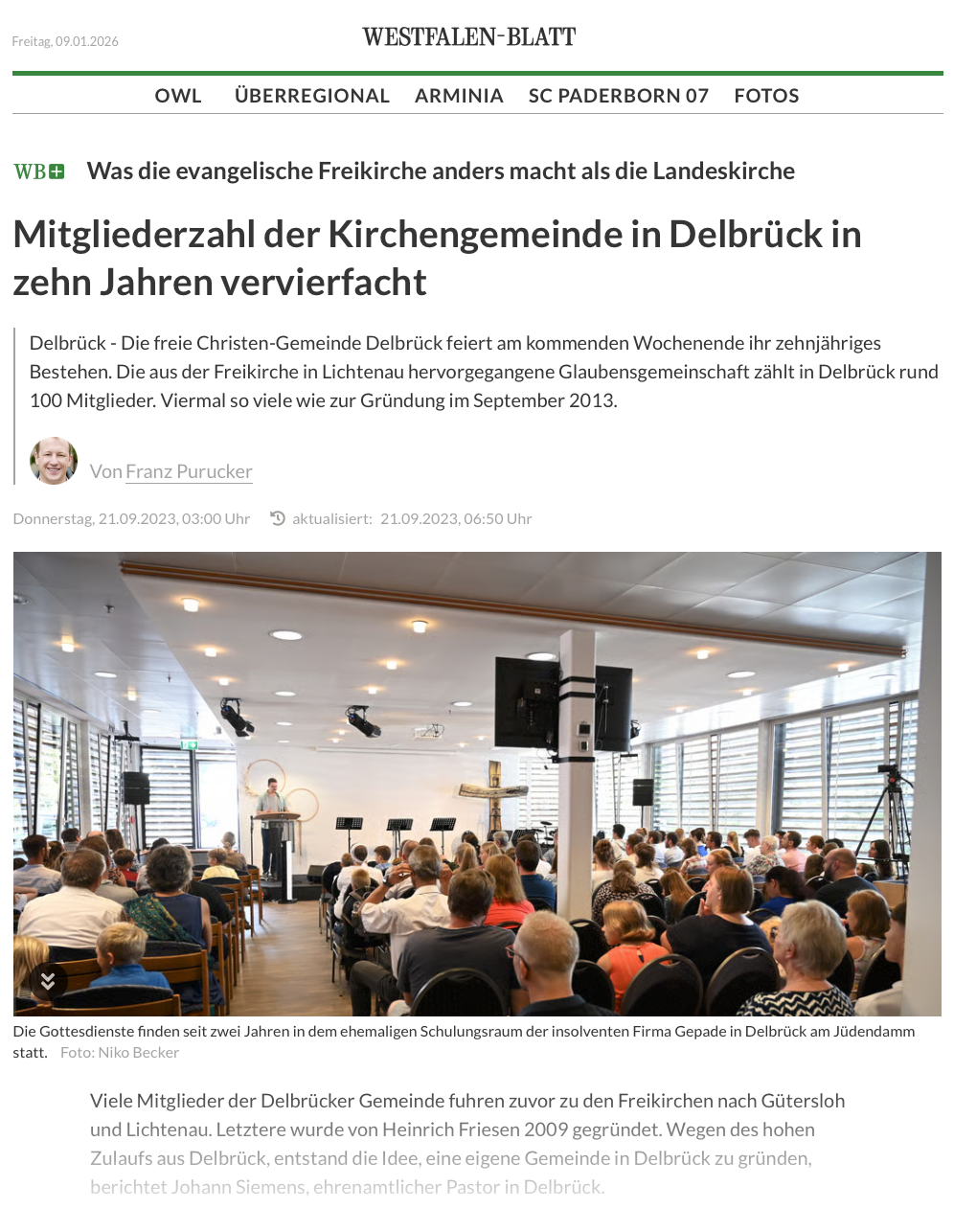Artikel im Westfalen Blatt zum 10-Jährigen Jubiläum der Gemeinde
